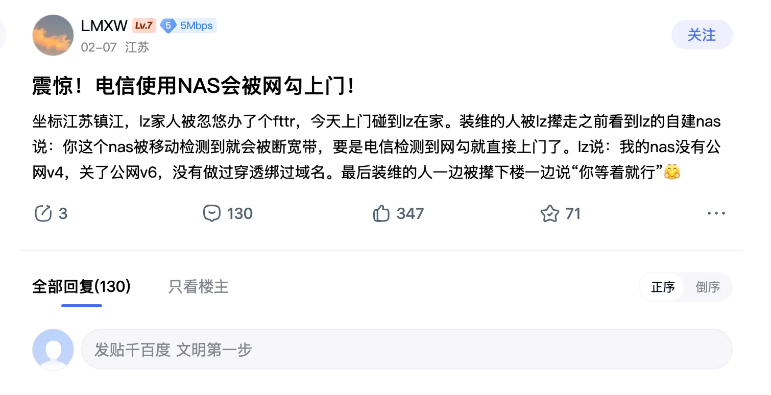 今天在贴吧刷到一个被气炸的网友发帖: 坐标江苏镇江,家里办宽带,装维师傅上门一看,角落里放了台自己玩的 NAS。 师傅没好气地直接甩下一句话:“你这机器要是被检测到跑流量,立马断宽带、直接上门查水表!” 哪怕网友拼命解释,自己只是纯本地存储,连公网 IP 都没有,装维师傅下楼前还是留了句狠话:“你等着就行。”